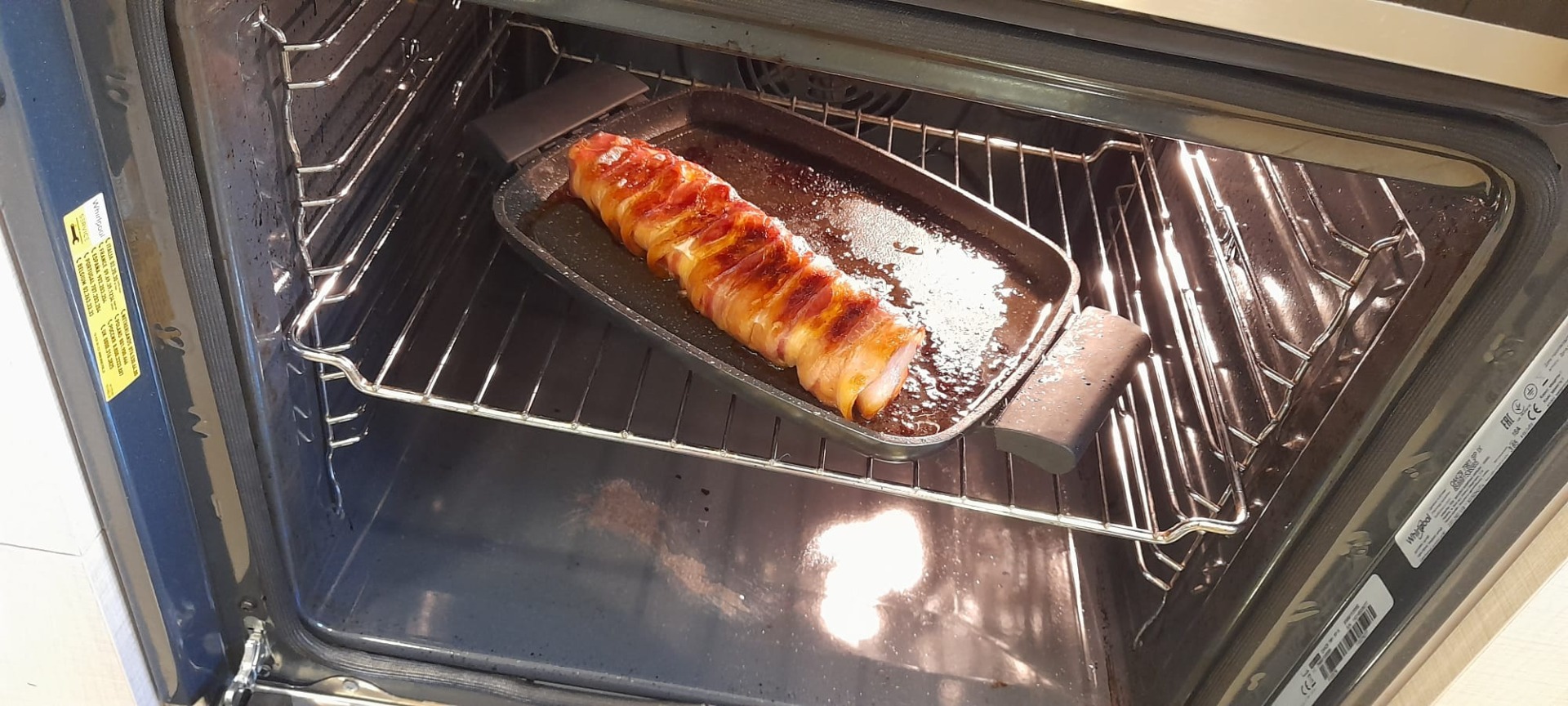 Am rulat cu grijă ajutându-mă de folia de plastic, iar când rulada a avut forma finală am strâns-o bine. Dacă aveți timp să o lăsați o oră-două la frigider, forma va fi mai frumoasă. Eu n-am avut și a ieșit și așa. Înainte de a o baga în frigider am desfacut cu grijă plasticul și am rostogolit-o pe o hărtie de copt în care am împachetat-o frumos, închizând bine și capetele. Și la cuptor cu ea, căldură sus-jos, 30 minute. La final, am scos-o din hârtie și am mai lasat-o 3 minute cu funcția grill a cuptorului ca să se rumenească frumos bacon-ul. Aveți grijă să verificați carnea să fie gătită (puiul este gătit la peste 75 grade), cel mai bine folosiți un termometru.