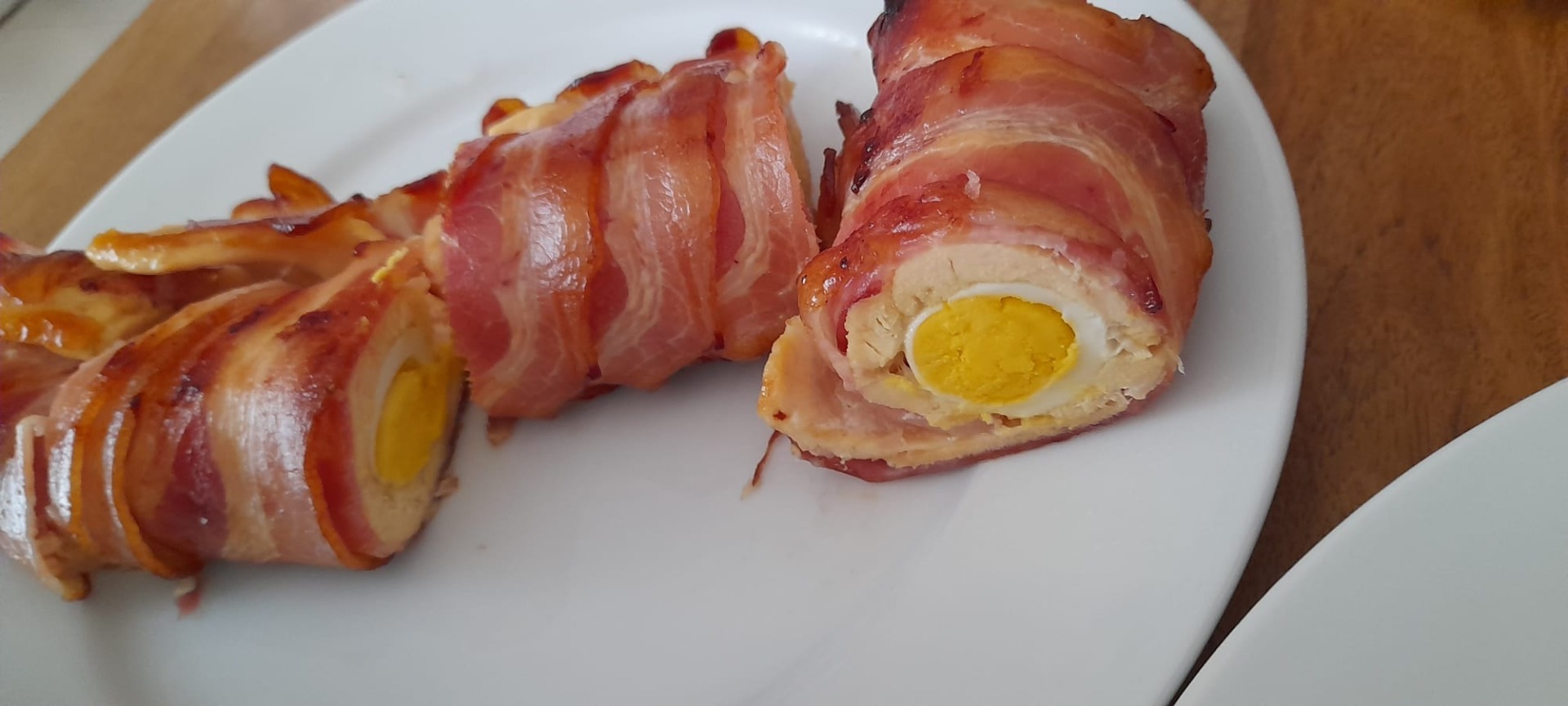 Așa că am întins o folie de plastic din aceea care păștrează mâncarea proaspătă și pe ea am pus, în forma unui dreptunghi, feliile de bacon (10 la număr, din acelea lungi). Le-am așezat una lângă alta, puțin suprapuse la margini. Deasupra am pus pieptul de pui tăiat în bucăți lungi foarte subțiri (1 piept de pui mai mărișor) în așa fel încât să acopere complet bacon-ul. Peste pui am presărat, în strat uniform, parmezan ras, iar ultimul ingredient au fost ouăle de prepeliță pe care le-am întins, în șir indian, pe latura cea mai lungă a dreptunghiului.
