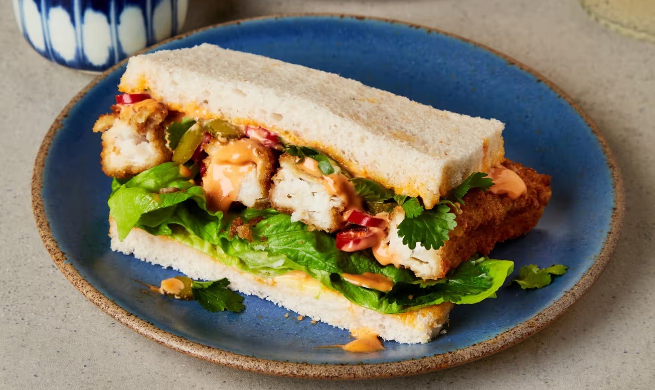 Această reinterpretare a sandvișului cu fish fingers și maioneză sriracha, este absolut delicioasă. Maioneza Kewpie adaugă un plus de umami, combinând peștele crocant cu aroma acrișoară a castraveciorilor din maioneză și iuțeala din sosuk sriracha, totul între felii de pâine moale, fără coajă. Rețeta este recomandată de The Guardian și este excelentă pentru prima masă din zi.