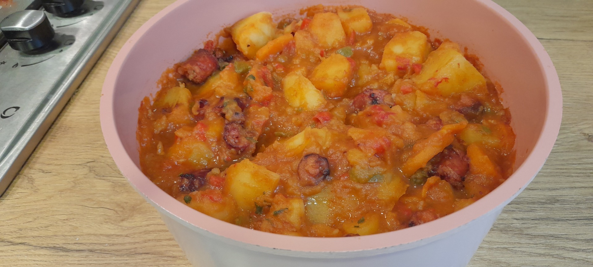 Atunci când în casă ai doar câțiva cartofi, o ceapă, doi morcovi și ți-au mai rămas doi cârnați de la grătarul de acum două zile, faci repede o tocăniță. Ieftin și bun.