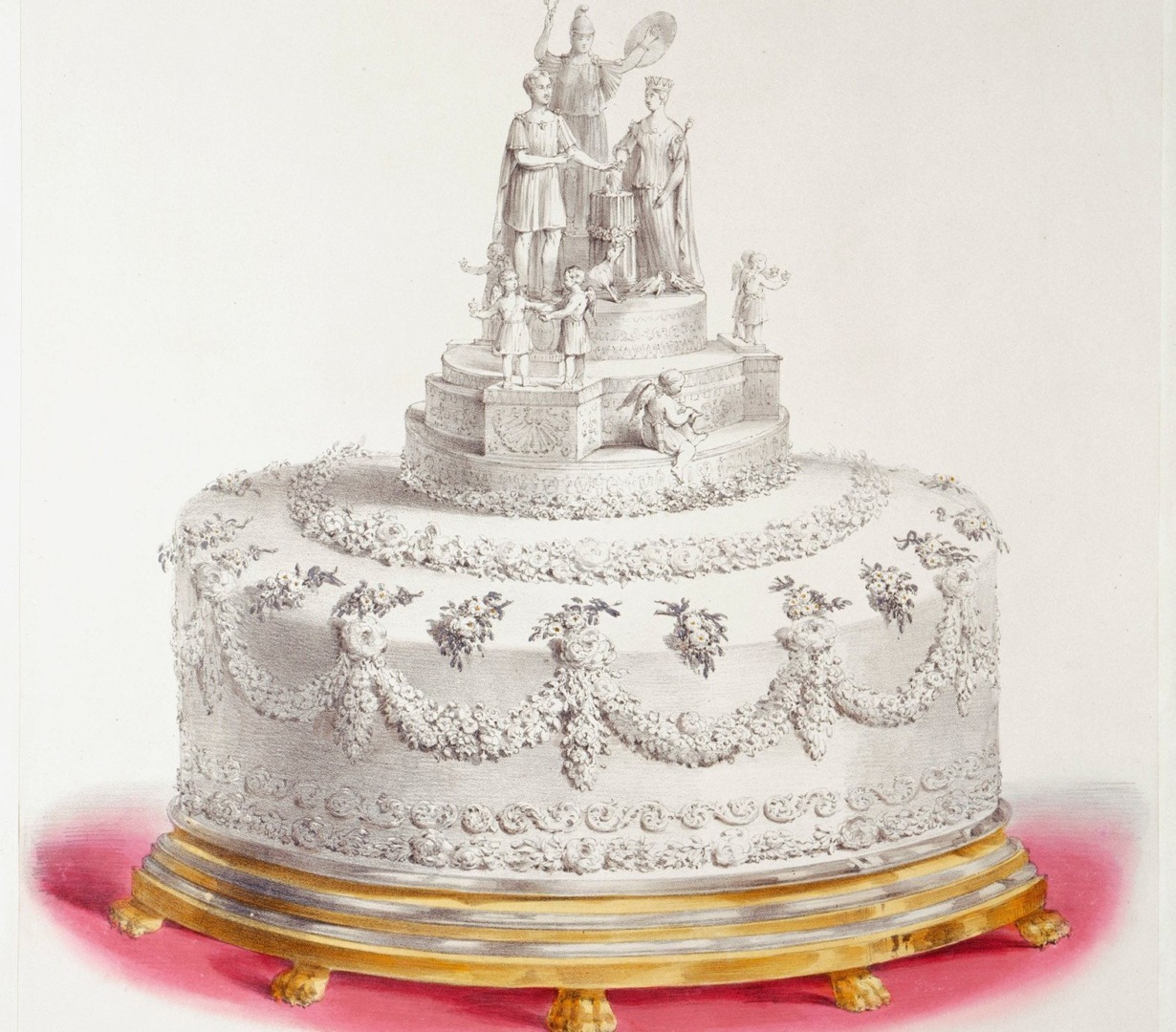 Era alb, acoperit cu glazură albă, decorat cu ghirlande și cu o statuie în miniatură simbolizând Marea Britanie, în vârf. La acea vreme, zahărul era un aliment extrem de costisitor și doar o familie de talia celei regale își putea permite acel tip de extravaganță. Dealtfel, acest tort celebru a mai intrat în istorie și pentru un alt motiv: a dat startul unui obicei încă prezent, mai exact rochia albă de mireasă. Până atunci, erau colorate.