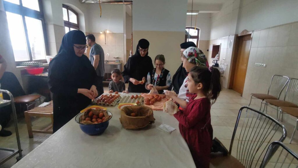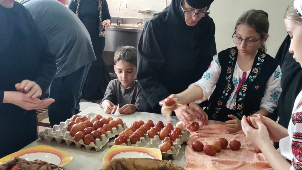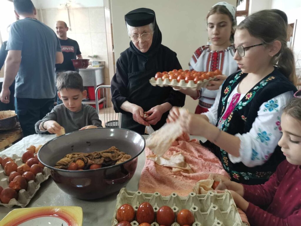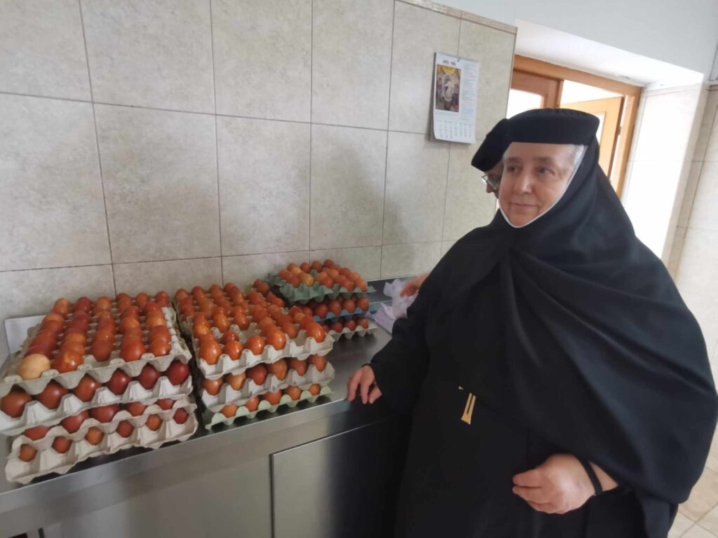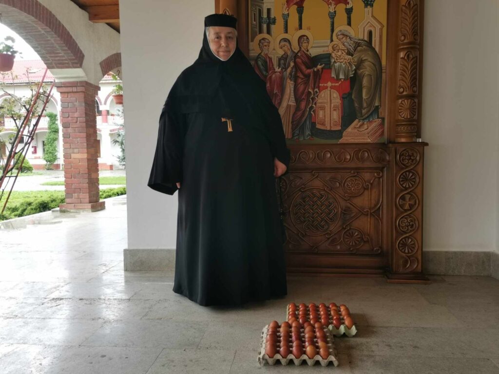 „Am primit și câteva ouă ca donație de la credincioși, dar am cerut să fie ouă de casă. Am adunat și vreo doi saci de ceapă, roșie și albă. Ouăle vopsite le folosim în zilele de Paști, la masa festivă. Suntem 60 de suflete în obște, iar sărbătoarea durează trei zile. În noaptea de Înviere le ducem la sfințit, apoi le oferim invitaților, iar o parte le împărțim celor nevoiași. Pe cele care se crapă le folosim la drob și la alte preparate”, a mai spus maica stareță.