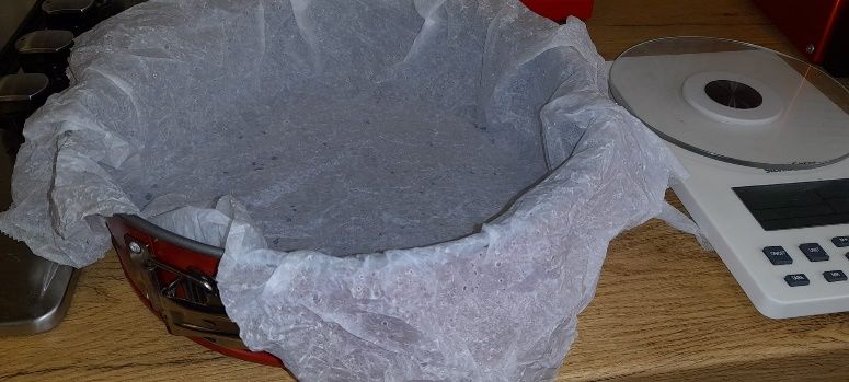 Se ia o bucată de hârtie de copt suficient de mare să acopere atât fundul cât și pereții tăvii. Eu am folosit o tavă cu diametrul de 26 de cm. Dacă reduceți cantitățile faceți într-o tavă mai mică. Se umezește hârtia și se stoarce ca să rămână doar umedă, nu udă și se întinde bine pe tavă. Se acoperă tava până sus.