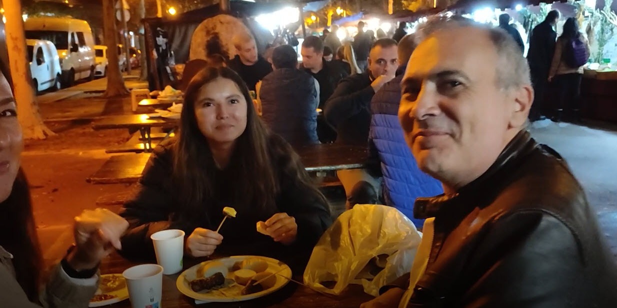 La o masă o familie de sud-americani testează un kurtocs kolac, așteptând micii să se rumenească pe grătar. Îi întreb dacă le plac micii.