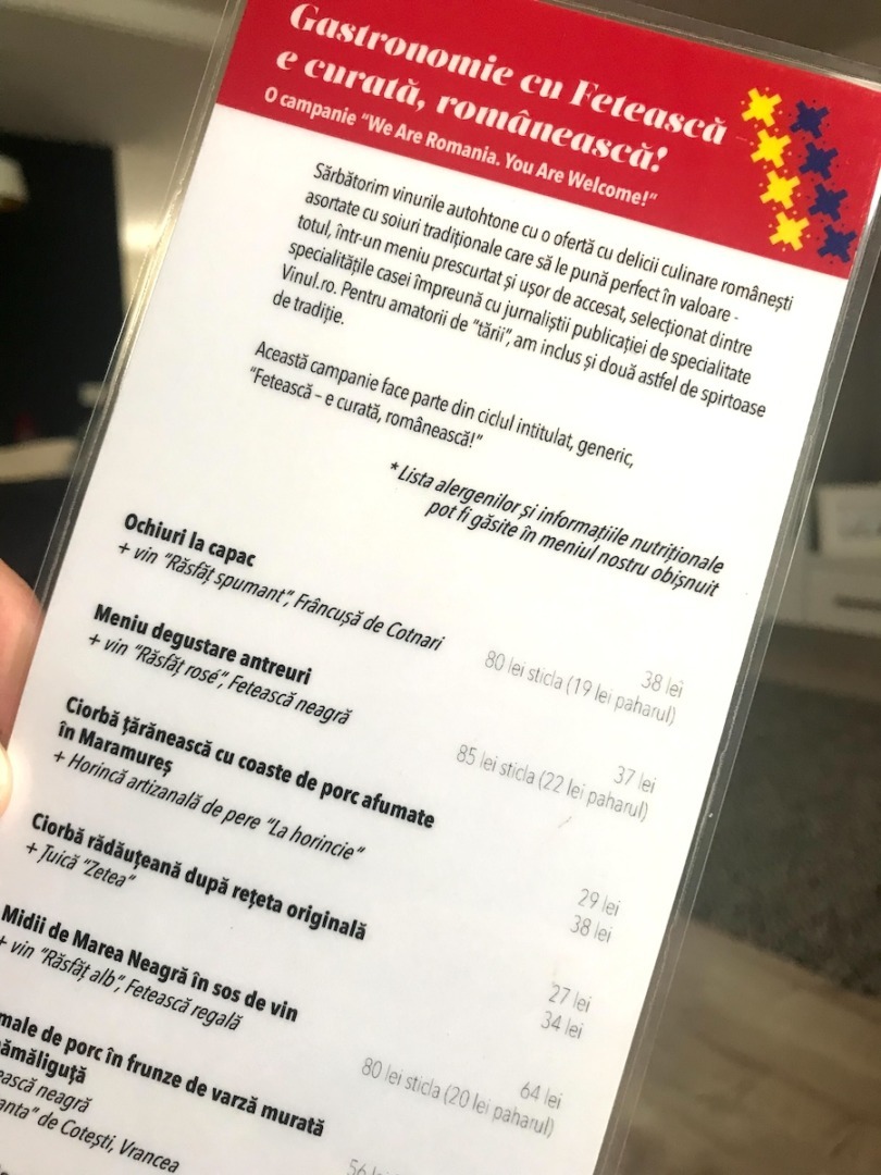 Pe durata campaniei, clienții vor găsi pe mese un meniu prescurtat, cu bucate de pe actualul teritoriu al României selectate din gastronomia locațiilor și asociate cu vinuri autohtone disponibile la sticlă și, majoritatea, și la pahar (nu doar din Fetească albă, regală sau neagră). De menționat că, în funcție de feedback-ul consumatorilor, e posibil ca Luna gastronomiei cu Fetească să dureze mai multe luni. Pentru iubitorii de tării, sunt propuse și 2 oferte de spirtoase tradiționale – o horincă de pere marca „La horincie” și o țuică „Zetea”.