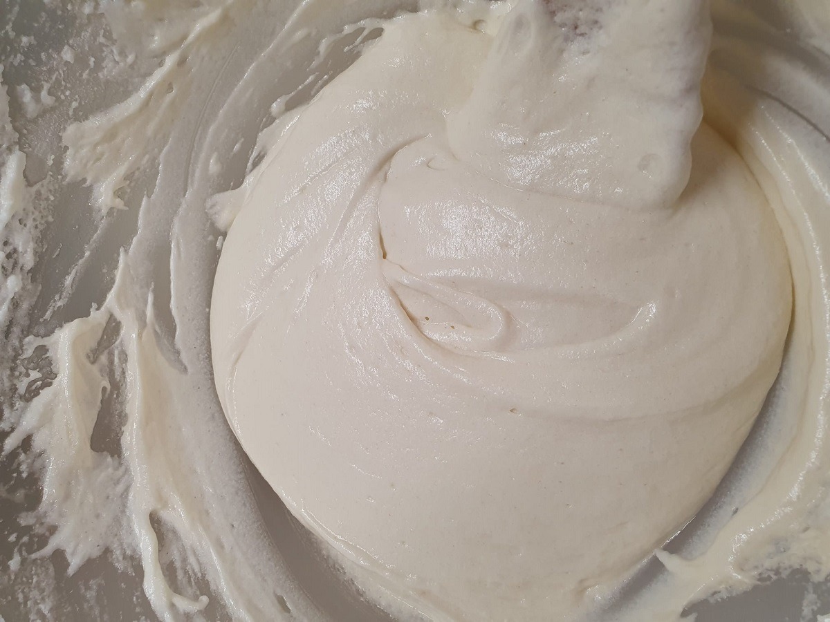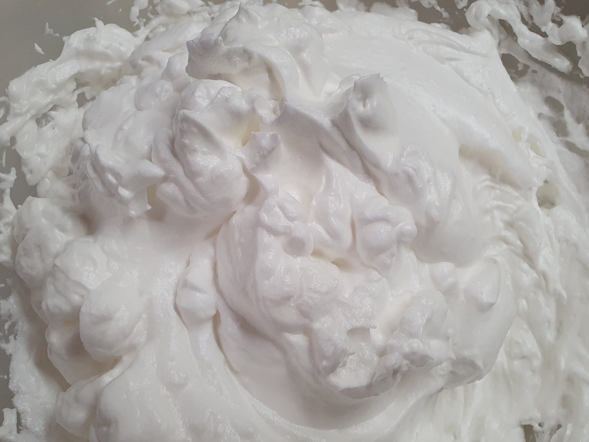 Într-un castron mare se pun albușurile și un praf de sare. Se bat cu mixerul până se formează o spumă albă și consistentă. Se adaugă treptat zahărul tos și vanilia, bătând în continuare cu mixerul. Se obține o spumă tare, ca pentru bezele. Când am terminat de pus tot zahărul, nu mai folosim mixerul.