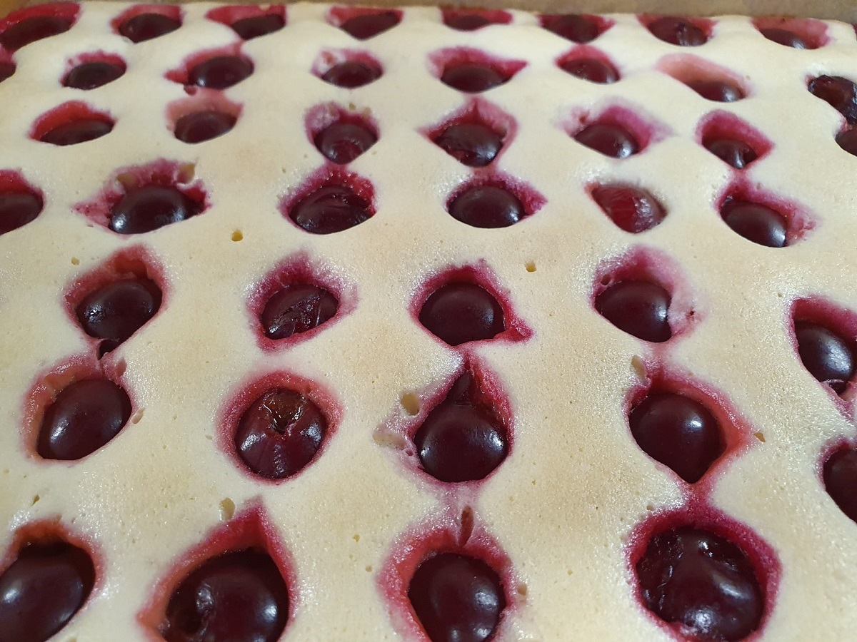 După ce au fost adăugate toate ingredientele, compoziția se toarnă într-o tavă tapetată cu hârtie de copt. Într-o tavă de 26×34 cm, stratul va avea aproximativ 1 cm grosime. Deasupra puneți fructe din belșug.