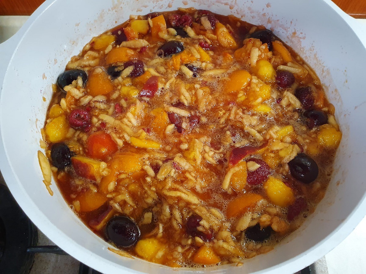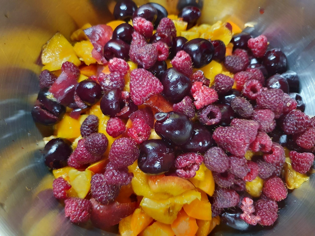 Strângeți toate fructele care vă prisosesc. Cu cât mai multe feluri, cu atât gemul va fi mai aromat. Pot fi cireșe, caise, piersici, nectarine, mere, pere, prune, zmeură, mure, afine. Spălați-le. Curățați merele și/sau perele și dați-le pe răzătoarea mare. Scoateți sâmburii cireșelor. Tăiați în bucăți caisele, piersicile, nectarinele, prunele.